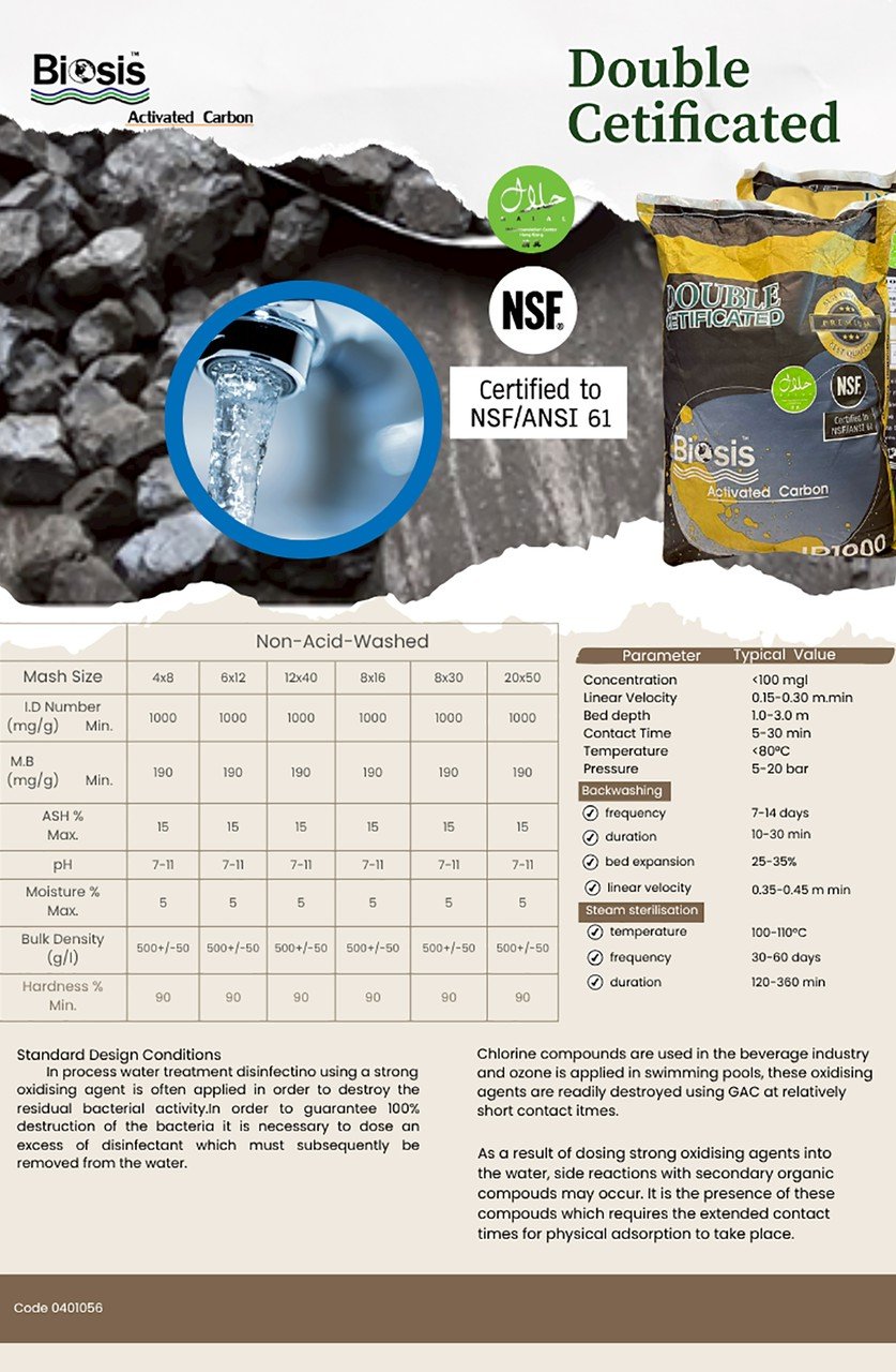 สารกรองคาร์บอน เกรดพรีเมี่ยมสำหรับการกรองน้ำ มีความเป็นธรรมชาติ Food Grade กรองรส , กลิ่น , สี , สารอินทรีย์ และสารตกค้างต่างๆ ที่ปนเปื้อนมากับน้ำ รวมทั้งกรองสารคลอรีน โลหะหนัก ยาฆ่าแมลง เป็นสารกรองที่ ผลิตจากกะลามะพร้าว ที่ผ่านกรรมวิธีเผา และให้ความร้อน จนได้สารกรองที่มีความพรุ่นสูง สารกรองมีลักษณะเป็นเกล็ดหรือเม็ดขนาดเล็กมีดำ มีขนาด Mesh Size 8 x 16 มีค่า ID (Iodine Number) 1000